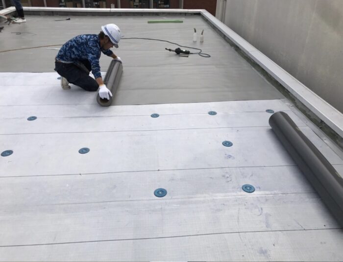 塩ビシート防水は、広い面積にも効率よく施工でき、シートの接合部を熱溶着することで、継ぎ目の少ない防水層を形成します。軽量で施工性にも優れているため、新築工事・改修工事のいずれにも適した工法です。